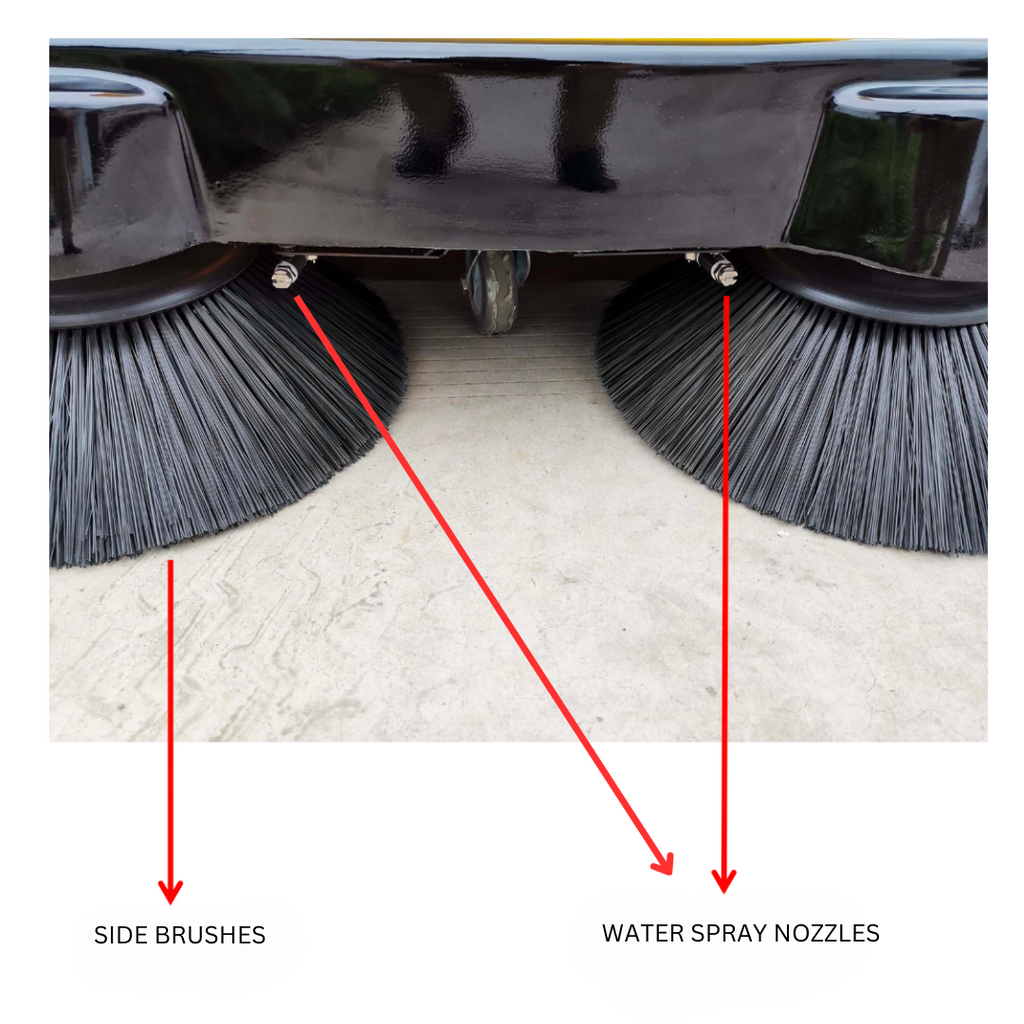 It comes with a sweeper with a water tank that helps control dust while you clean. Just press one button to use the water spray system. This feature especially helps to suppress dust, preventing it from becoming airborne. This is particularly useful in areas with heavy dust accumulation, improving air quality and reducing respiratory risks for workers.
