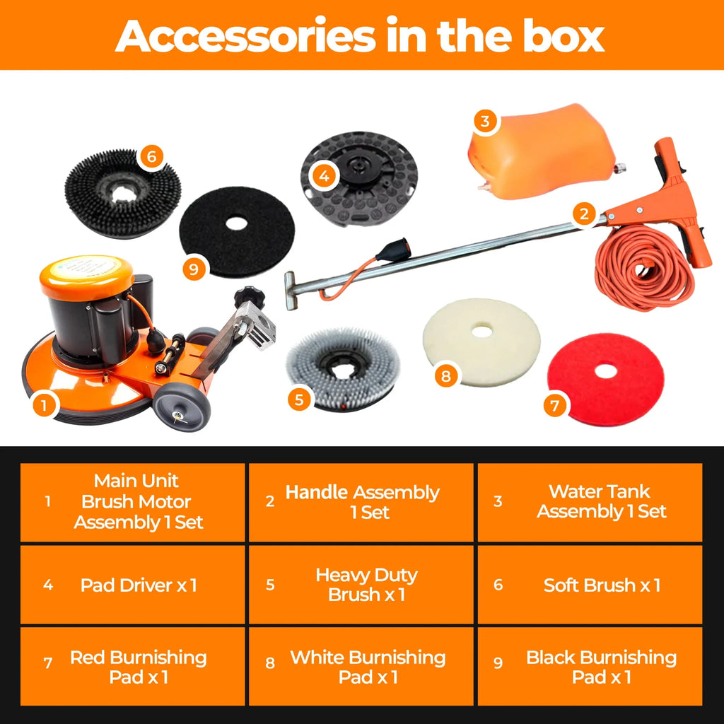 - The package includes a main unit with a brush motor assembly, handle assembly, water tank, pad driver, 2 brushes, 3 scouring pads and 1 pad driver to tackle any cleaning task.