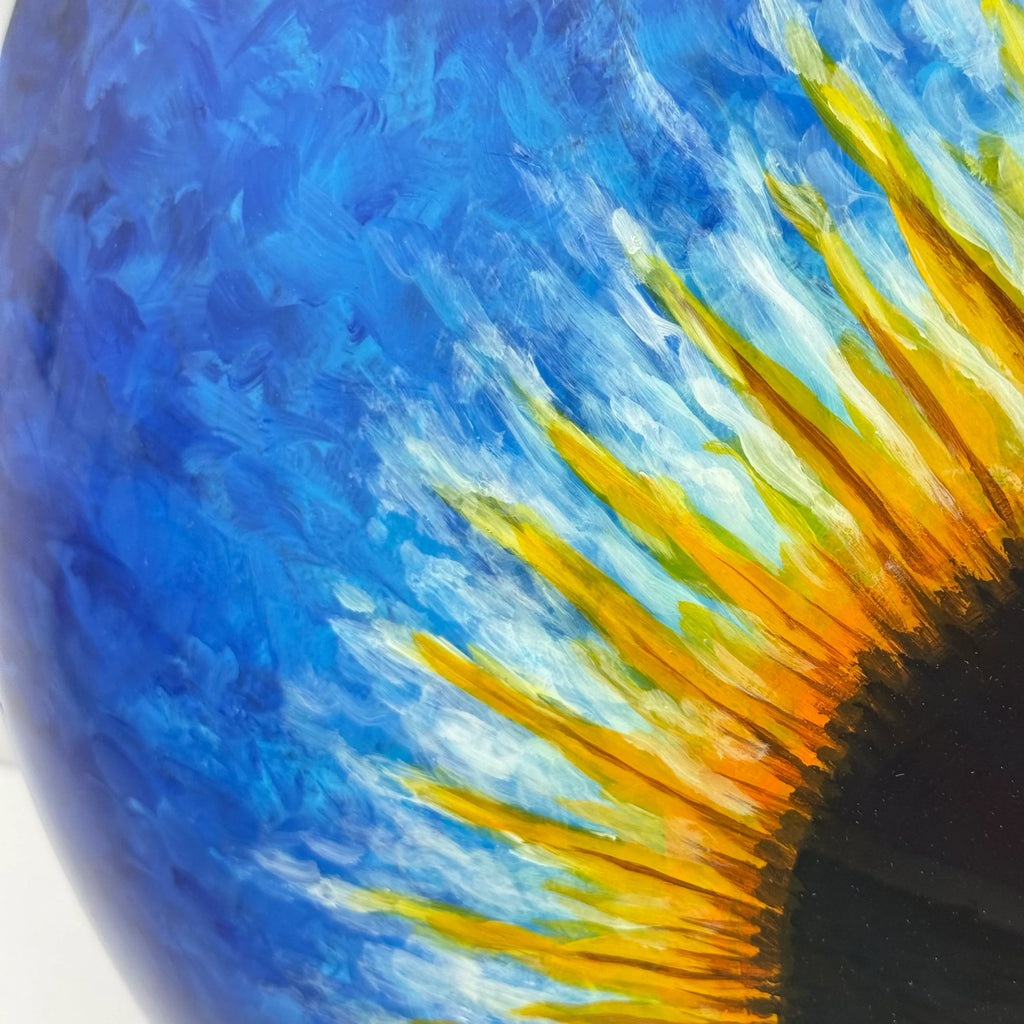 Solar Iris is a hand-painted convex iron sculpture finished with a clear resin coating that enhances its vibrant depth and shine. Radiating with fiery gold and celestial blue, the design evokes the hypnotic detail of an iris fused with the energy of a solar flare. Bold and luminous, this piece brings a sense of cosmic vision and heat to any space.