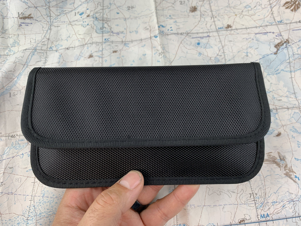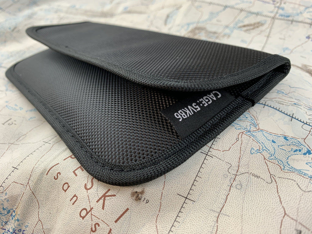 The Stealth Electronics Pouch Is made of ballistic nylon material over Stainless Steel Faraday shielding material. There is a larger internal pocket (4.5" x 7.25") that was designed for phones, and a slightly smaller pocket (3.5" x 7.25") that provides limited RF Shilding and is perfect for documents.