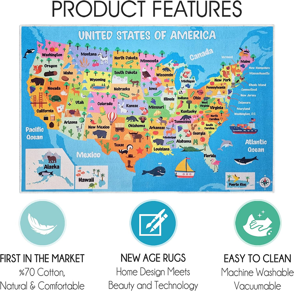 Sussex Home Low Pile Kids Rug for Playroom - Washable Cotton Educational Rug for Kids Room - 39.5 x 59 Inches - Usa Map Pattern