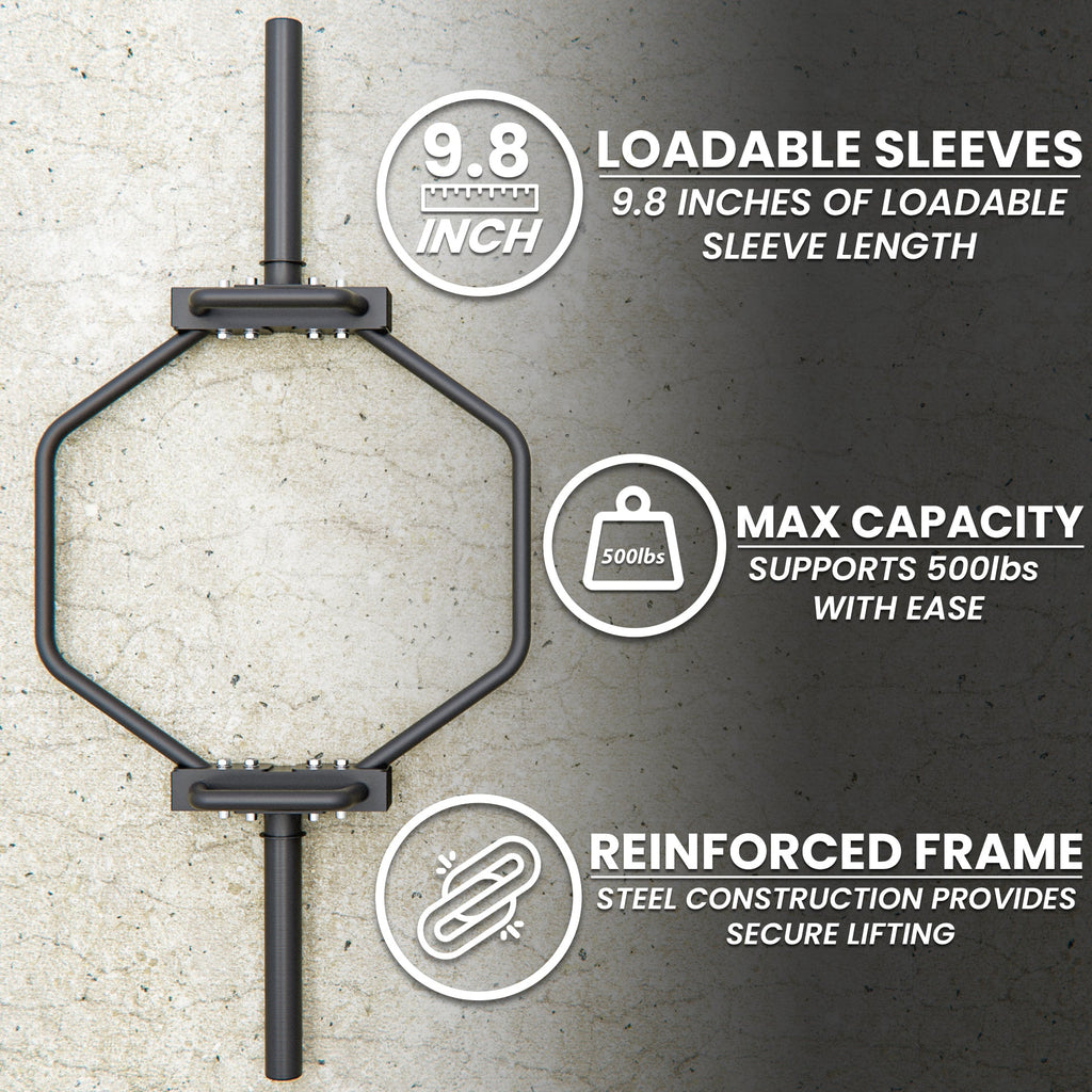 - Our 25kg Hex Bar with rotating handles and 10” sleeves. Maximum load rating of 750lb.