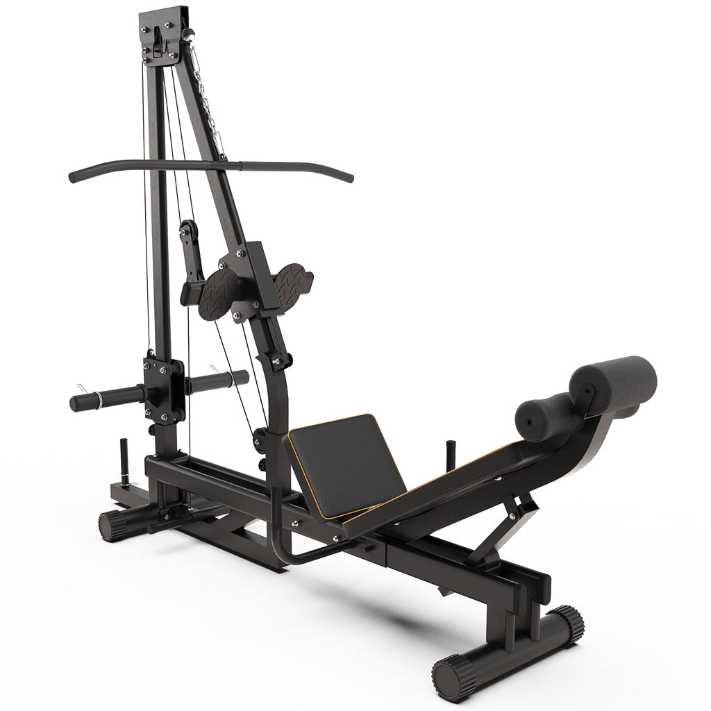 To keep you safe during your reps, this press machine has a brake to keep the weight suspended until you’re ready to lift. And once you’re ready, it’s easy to flip down and get pressing. As well, this machine comes equipped with a lat pull down bar that easily clips into the pulley system. Lower and upper body machine, all rolled into one?