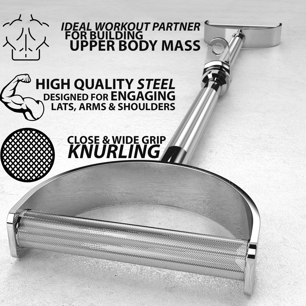 Constructed from solid steel with a hard chrome finish, the Synergee Pro Lat Bar is built to handle heavy loads while resisting rust, corrosion, and wear. The precision-knurled handles provide a firm, non-slip grip that stays comfortable even during high-rep sets or heavy pulls.