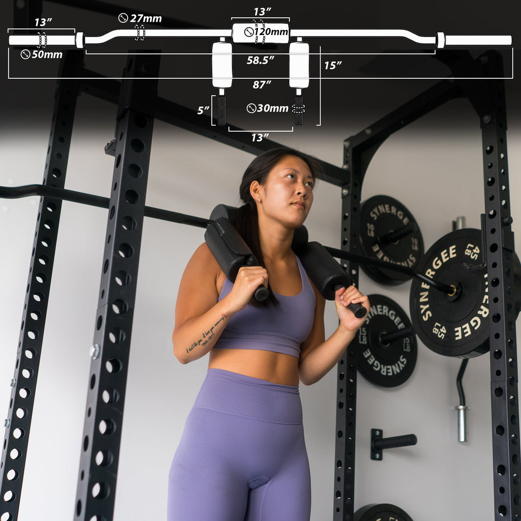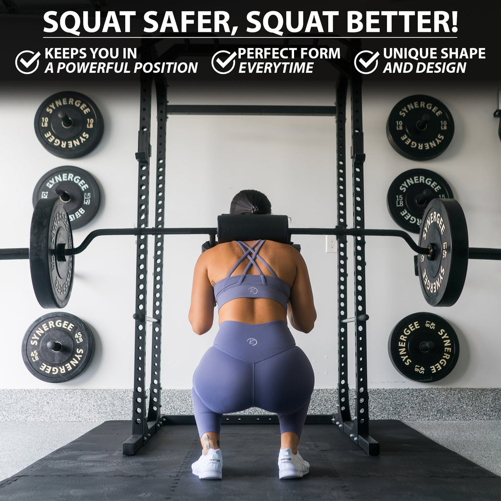 The Synergee Safety Squat Bar adds stability and comfort to your squat workouts! The padding adds comfort for your neck and shoulders, the cambered position allows for a more upright squat that places less pressure on your lower back. This bar will target your glutes and quads and allow for a greater range of motion and more gains!