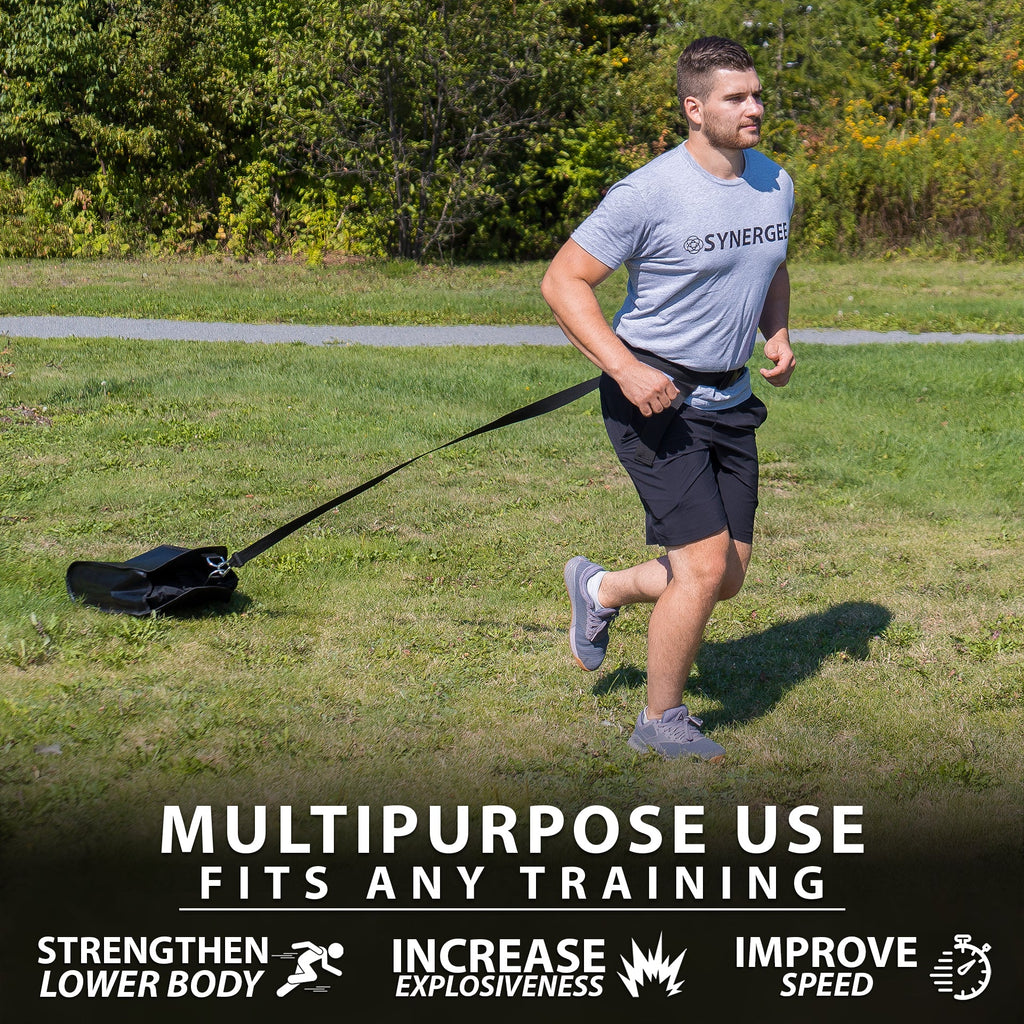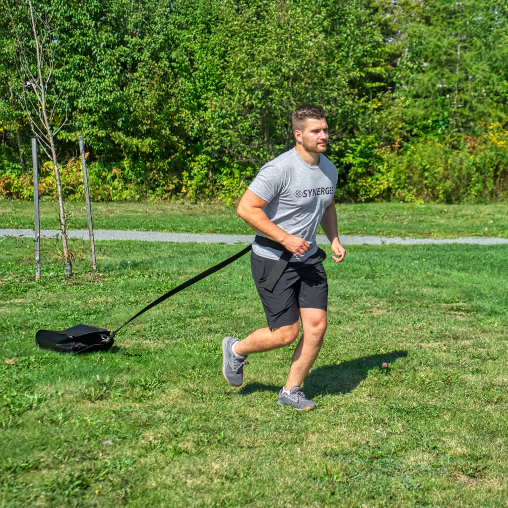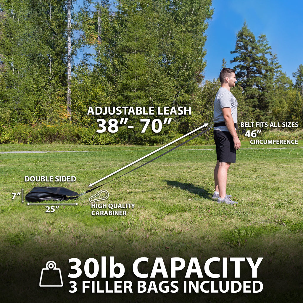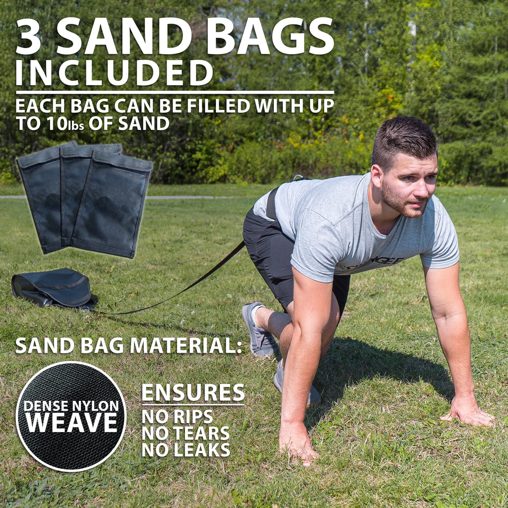 Sprinters, football players, and other athletes that need to accelerate quickly and efficiently will LOVE this Speed Sled. Fill the nylon bags with sand; fill the sled with the bags; set the harness on your waist; and take it for a sprint! Each bag can be filled with 10 lb of sand (sand not included) and each sled comes with 3 bags. Velcro straps in the sled keep the weighted bags in place, and the belt sits comfortable on your waist and attaches to the sled with a ring that is specifically constructed to allow for quick changes in direction. The belt and leash are adjustable for different athletes with various training needs. If your goal is to become faster, this is the gear for you!