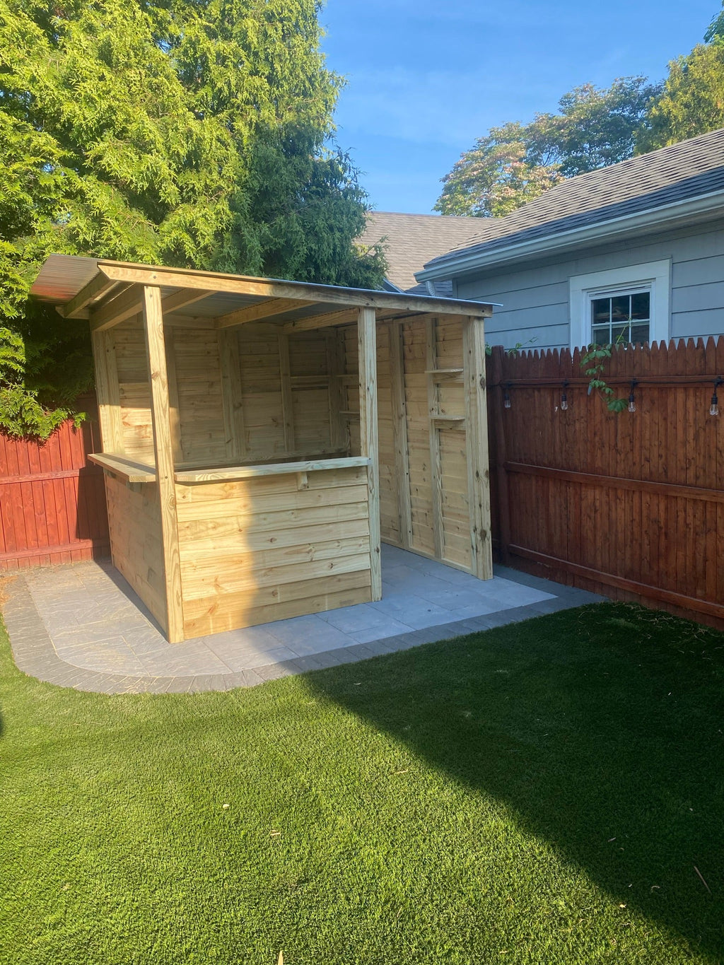 The Eyre Square is ideal for corner situations with (2) full height walls which can be placed on any side. This model comes standard with two 10" wide interior countertops and we can install up to 8 back and side wall shelves.