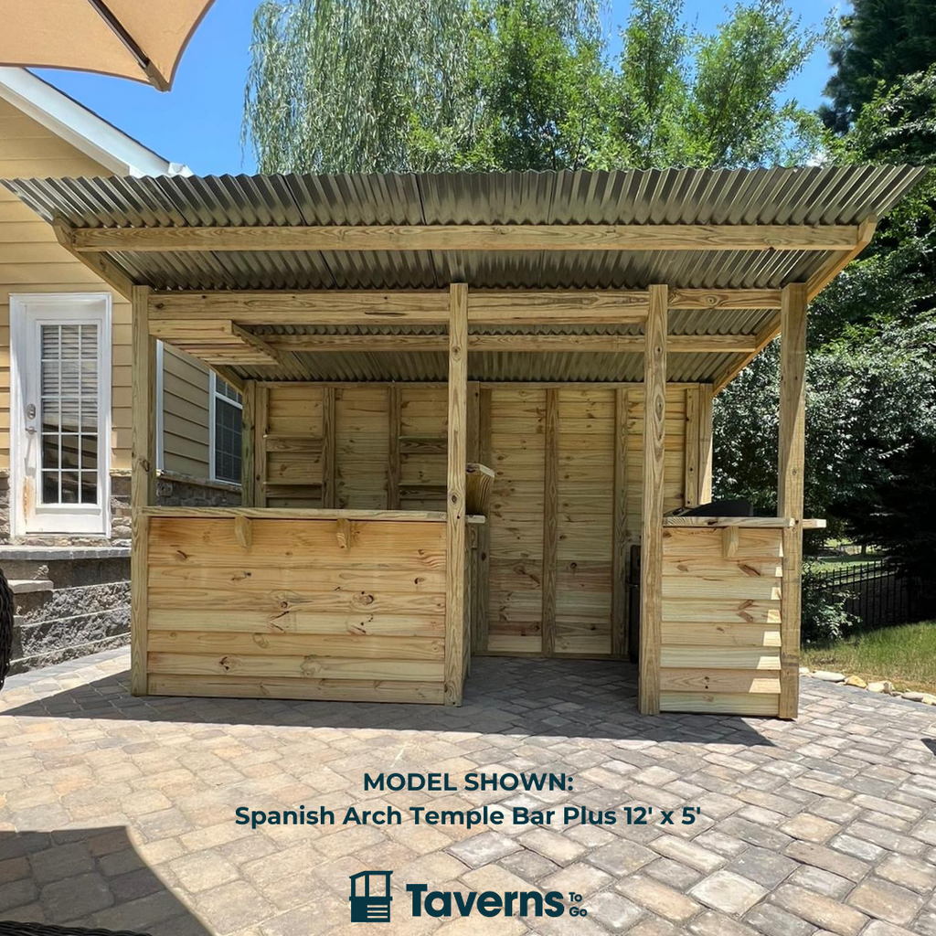 For dimensions, be sure to visit the drawings on our ORIGINAL COLLECTION and add 6' to the width for the grill extension.  The extension can be added to the left or right hand side - it's interchangeable, just tell us your preference on the day we arrive to assemble your Tavern.