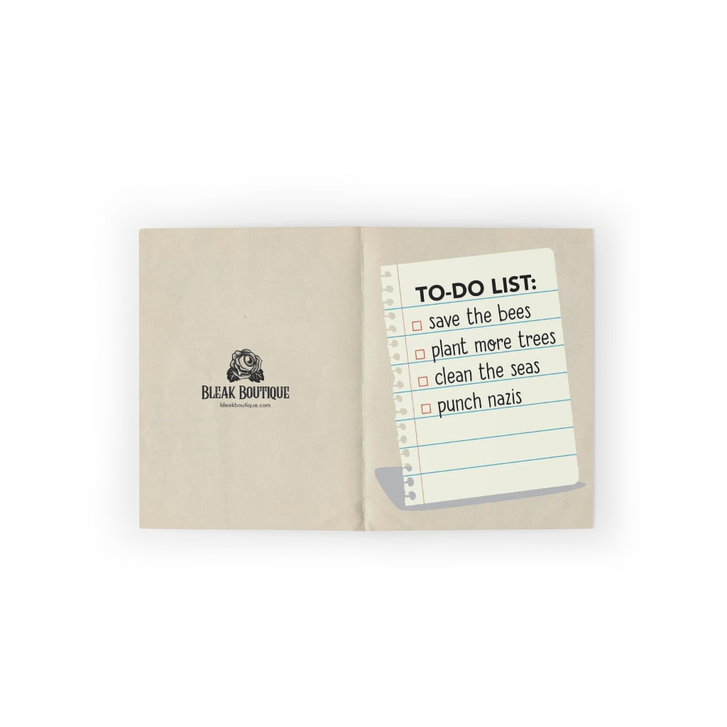 This card reads "To-Do List" on the front with a checklist of essential tasks below. The interior has plenty of room to add your own message. This card is printed on heavy matte card stock and includes a matching white envelope.