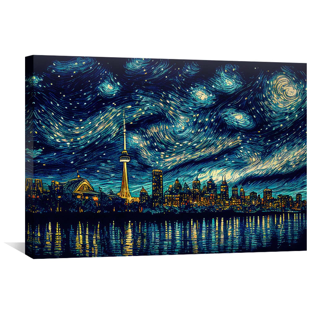 Bring a touch of classic art into your home with this stunning canvas wall art featuring a painting in the style of Van Gogh's Starry Night, featuring Toronto. The use of blue and yellow colors creates a mesmerizing and beautiful piece. Made from high-quality canvas, this wall art is a durable and long-lasting addition to your decor. You can also choose to frame wall art piece to add a more polished look. Whether you're looking to make a statement in your living room or add a touch of culture to your office, this Toronto Starry Night canvas wall art is sure to impress.