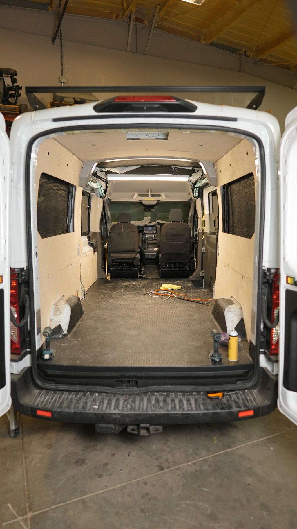 The kit is CNC cut from 1/4” material of your choice. The van panel kit is specifically designed for the crew floor plan and includes rear walls, rear ceiling, and rear doors. It is patterned for 4 lights in the ceiling and for all of the factory threaded inserts for hanging/attaching your overheads and furniture. The ceiling also gives access to the locations of factory holes where riv nuts can be added for additional fastening points. Crew wall to ceiling support included. Foam trim pieces to transition from the rear cargo area to the front passenger area are included.
