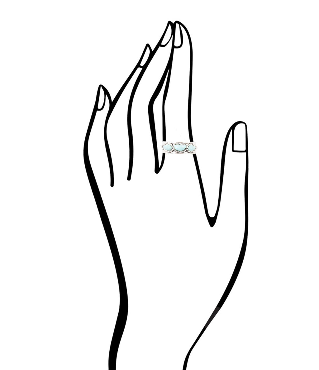 Treat yourself or a beloved one to this stunning Triple Stone Simplicity Turquoise and Sterling Silver Ring. Carefully crafted with three genuine turquoise stones set in roped sterling silver bezels, this exquisite piece will be the perfect addition to any collection. Each stone measures .25" in length, the ring weighs .18 oz, and the total width of the band is .25", making for a luxuriously lightweight piece. Crafted and finished by hand, this ring is sure to make an elegant statement.