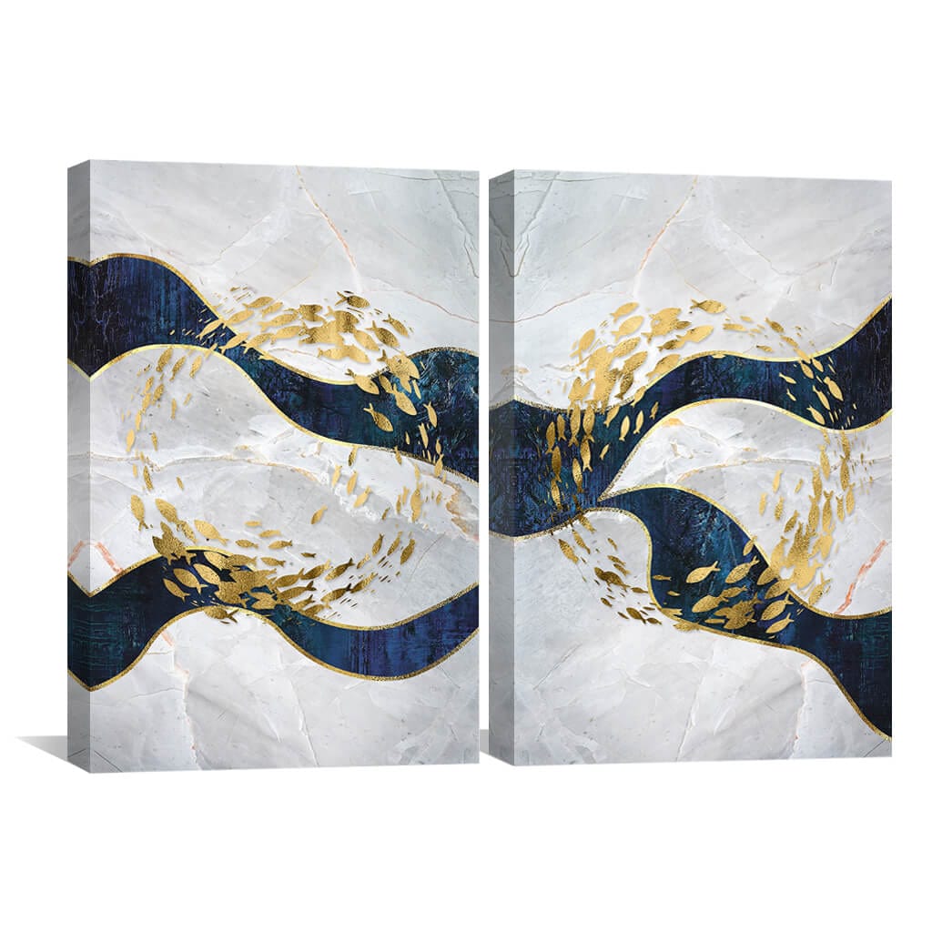 Give any open wall in your home a tasteful touch of glamour with this painting print. This canvas showcases an abstract design of a school of fish and blue and white tones.