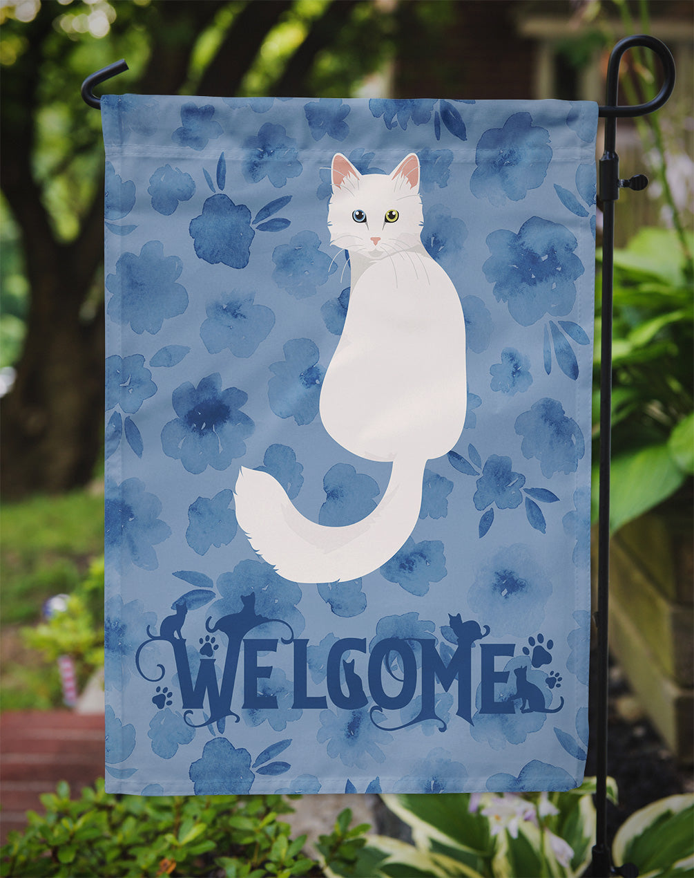 Shown here is the Turkish Angora Cat Welcome Garden Flag from Caroline's Treasures featuring artwork of a Turkish Angora in a Welcome design. The detailed illustration and vibrant colors make it a standout accent for your home. Enhance the beauty of your garden, patio, or yard with Caroline's Treasures Decorative Garden Flag, proudly made in the USA. Crafted from two pieces of thick, double-sided polyester fabric, this 2-ply garden flag is designed to withstand various weather conditions, making it water-resistant and weatherproof. Featuring correctly readable words on both sides, this garden flag offers a delightful visual experience from any angle. With its heavier weight, it stands out among other garden flags, ensuring stability and durability even in wind, rain, and snow. Measuring approximately 11 1/4 inches by 15 1/2 inches, this flag allows you to personalize your outdoor decor. It comes with a 1 1/2-inch sleeve sewn in, allowing easy attachment to any standard garden flag stand or garden size porch hanger (sold separately). Make a statement in your outdoor space with Caroline's Treasures Decorative Garden Flag, a vibrant and high-quality flag that adds color and personality to your surroundings. Proudly made in the USA, it's a symbol of quality craftsmanship and attention to detail. Perfect for: Front porches, gardens, yards, patios, Welcome decorating, Cats-themed homes, or year-round display for Turkish Angora enthusiasts Makes a heartfelt gift for: Turkish Angora owners, Cats lovers, Welcome gifts, pet parents, friends who adore their Turkish Angora, or anyone celebrating Cats.