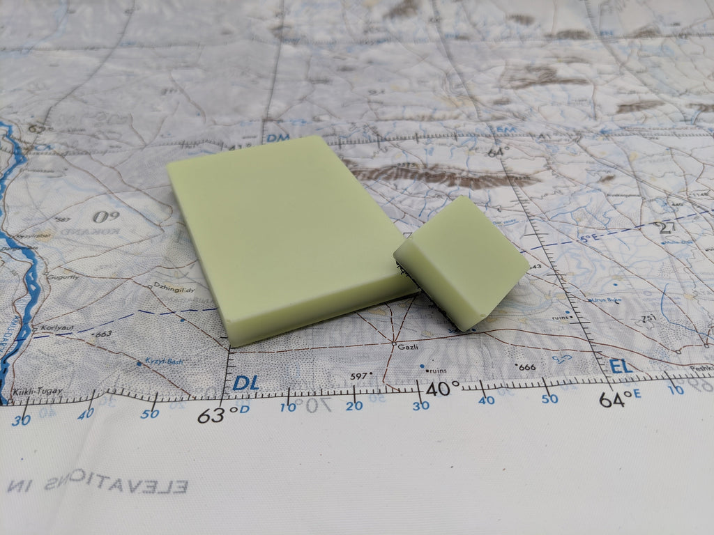 The 1” x 1"  Universal Glow Markers (UGM’s) Patch or simply Glow In The Dark Epoxy Resin Bars are perfect for marking all your gear making it easy to find in the dark. These are a super bright, long lasting, reusable glow bar stock that does not wear out with quick stick hook backing. They do not use batteries, bulbs or electricity.