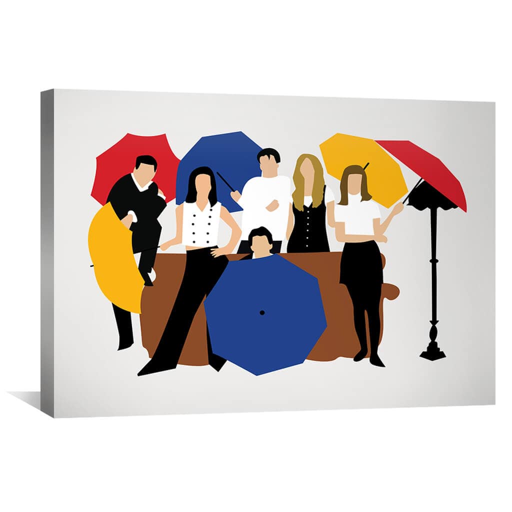 Give any open wall in your home a tasteful touch of glamour with this painting print. This canvas showcases an abstract design of the Friends cast with umbrellas.