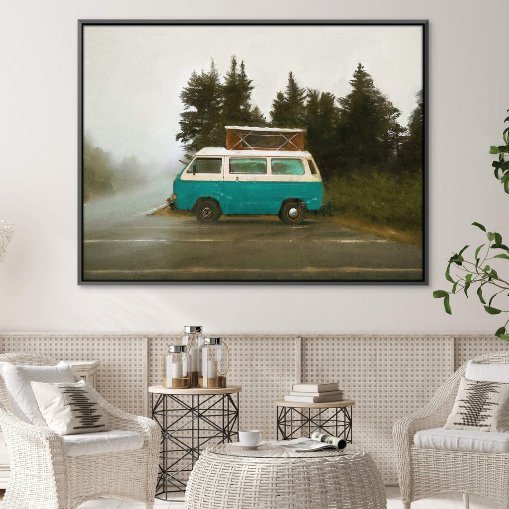 Give any open wall in your home a tasteful touch of glamour with this painting print. This canvas showcases classic VW travel van on a rainy road trip.