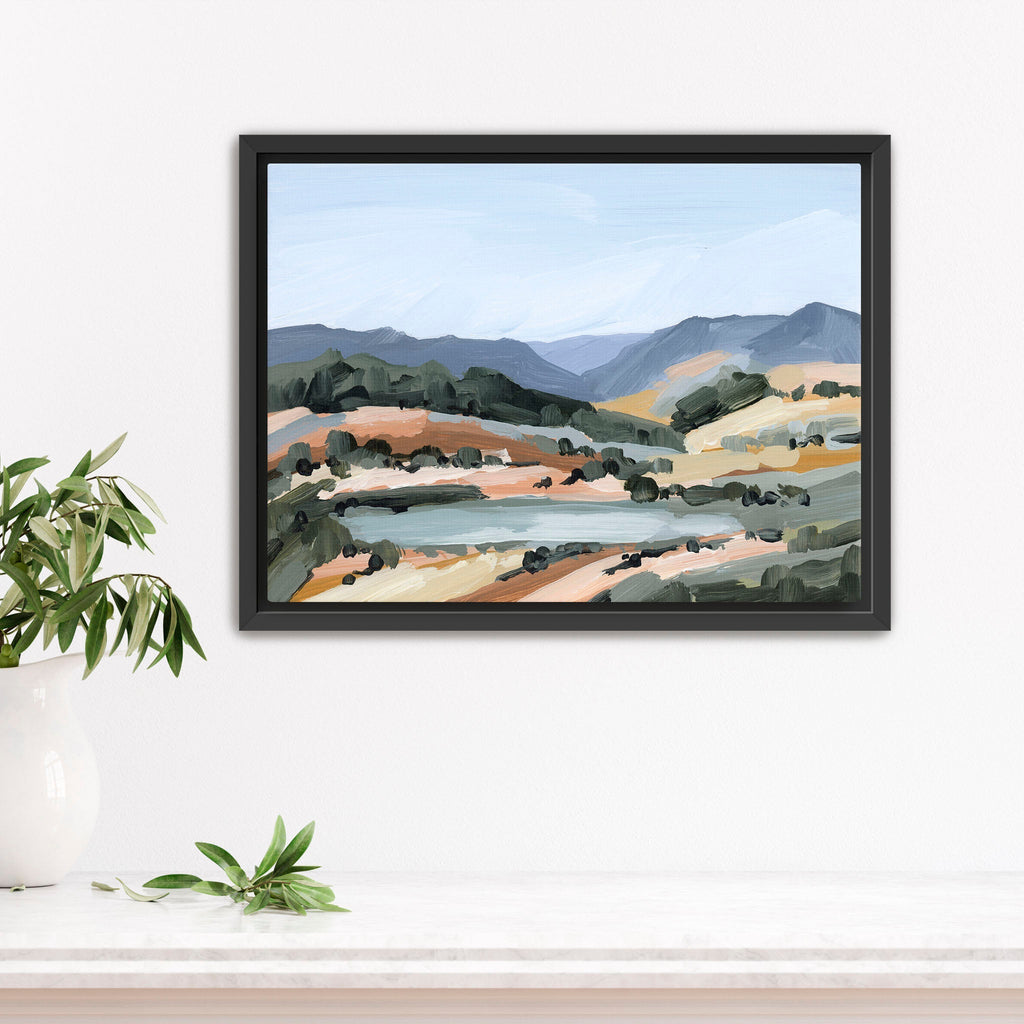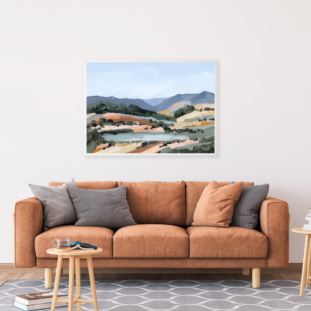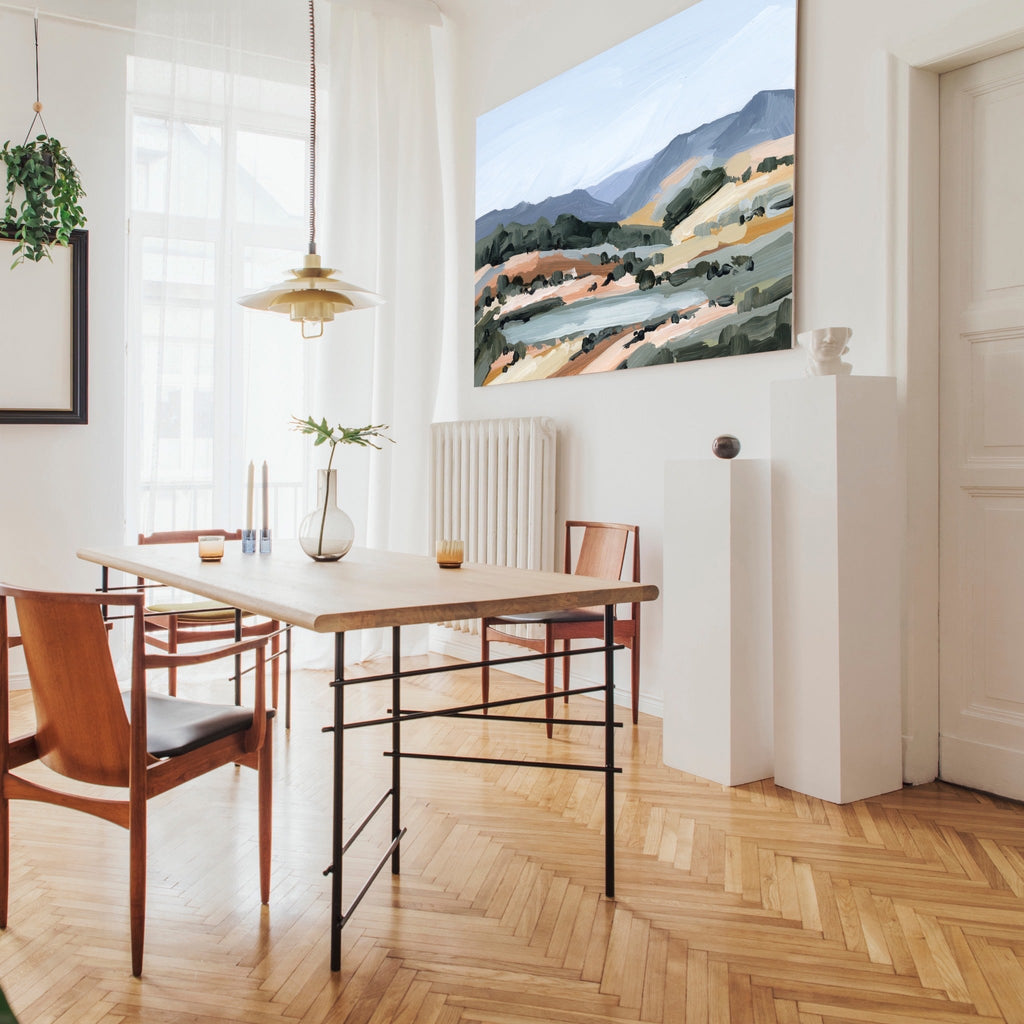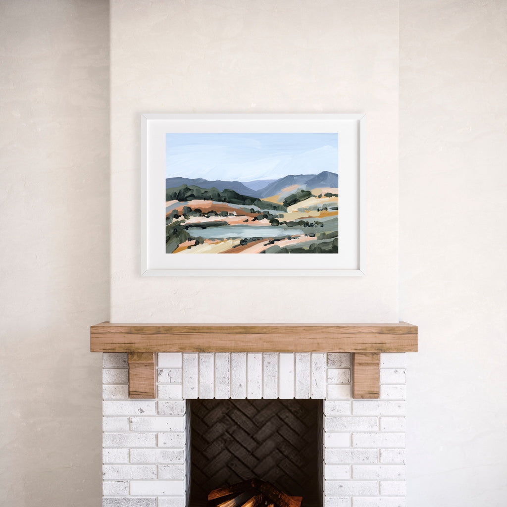 The fine art print of "View From Here" is a reproduction of an original acrylic landscape painting inspired by the diverse and colorful scenery of beautiful Utah. With playful brushstrokes and vibrant colors, this mountain wall art captures the essence of the iconic Rocky Mountain landscape. Available in a variety of art print sizes, this abstract landscape art print showcases a minimalist, impressionist style and is perfect for bringing the beauty of Utah into your home.