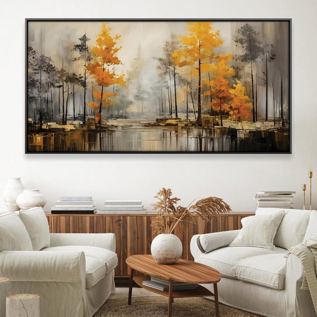 Presenting "Watercolor Autumn" canvas wall art, a breathtaking tribute to the beauty of the fall season. This watercolor masterpiece showcases the enchanting charm of autumn trees along a tranquil river. The title beautifully captures the essence of the artwork, where the vibrant yellows, rich browns, and deep blacks evoke the warmth and tranquility of this season. Elevate your decor with "Watercolor Autumn," available in both canvas wall art and framed wall art, and invite the serene allure of autumn into your living space.
