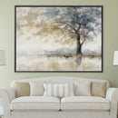 Give any open wall in your home a tasteful touch of glamour with this hand painted oil painting. This painting showcases a watercolor tree featuring yellow, blue and brown brush strokes hand painted by the artist.