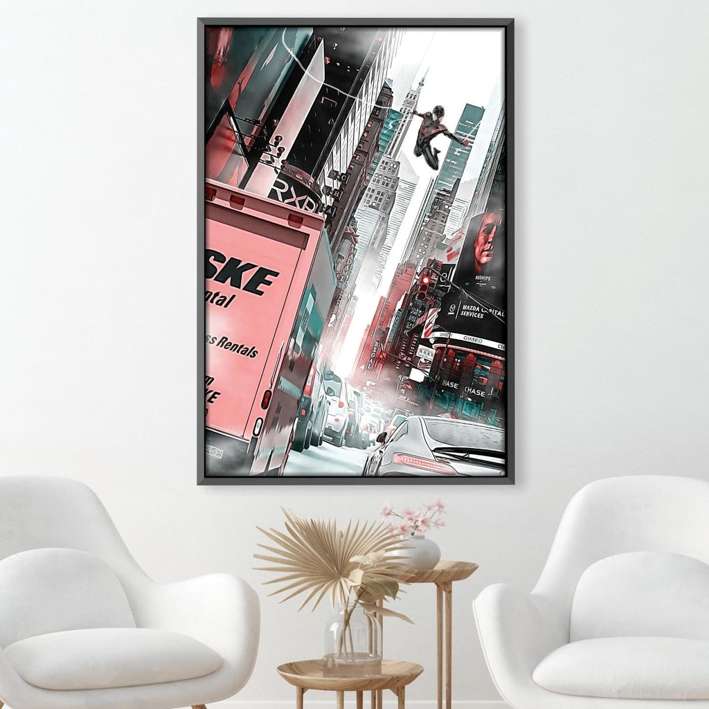 Give any open wall in your home a tasteful touch of glamour with this beautiful print. This canvas showcases a classic comic book character in New York City.