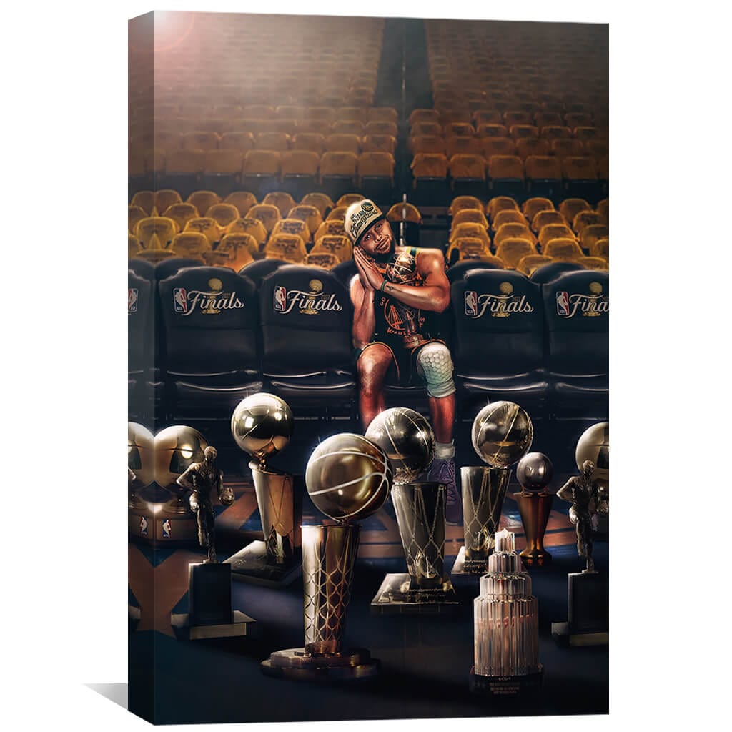 Steph Curry silenced all the haters with his goodnight gesture surrounded by all his trophies. Beautiful canvas art that needs to be displayed on your wall.