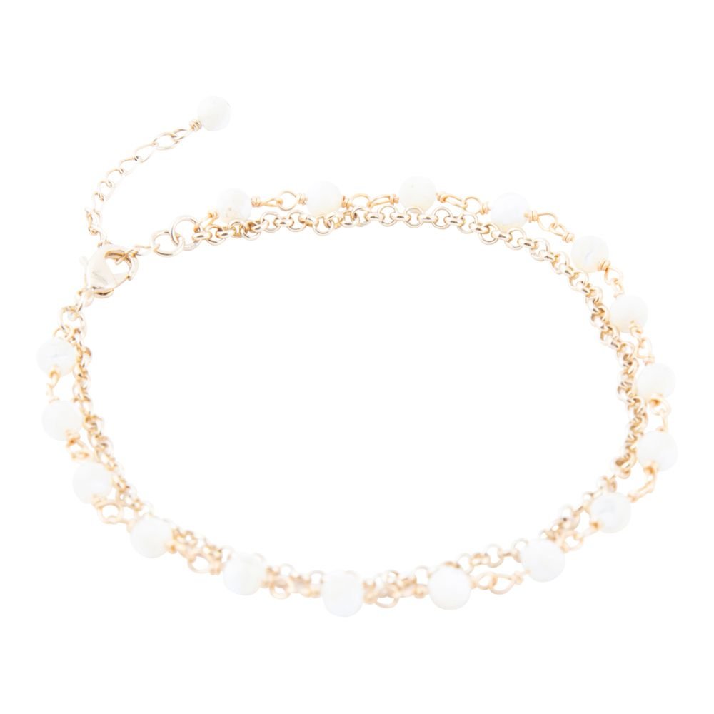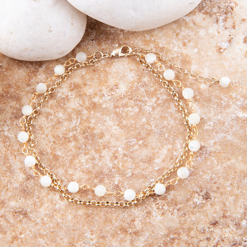 This bracelet is handcrafted and features two strands of a stunning golden brass chain. One of the strands is adorned with genuine white mother of pearl beads. Measuring at 7 inches in length with a 2-inch chain extender, it is finished with a secure lobster clasp. It has a width of .13" at its widest point. It's total weight is 4.65g, making it a lightweight and elegant addition to any jewelry collection.