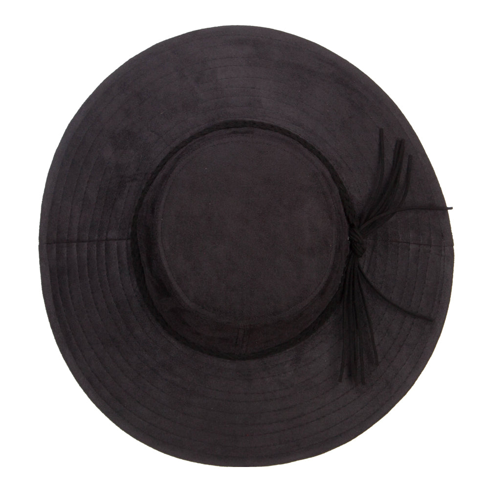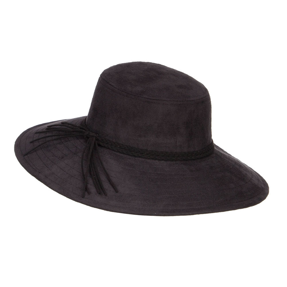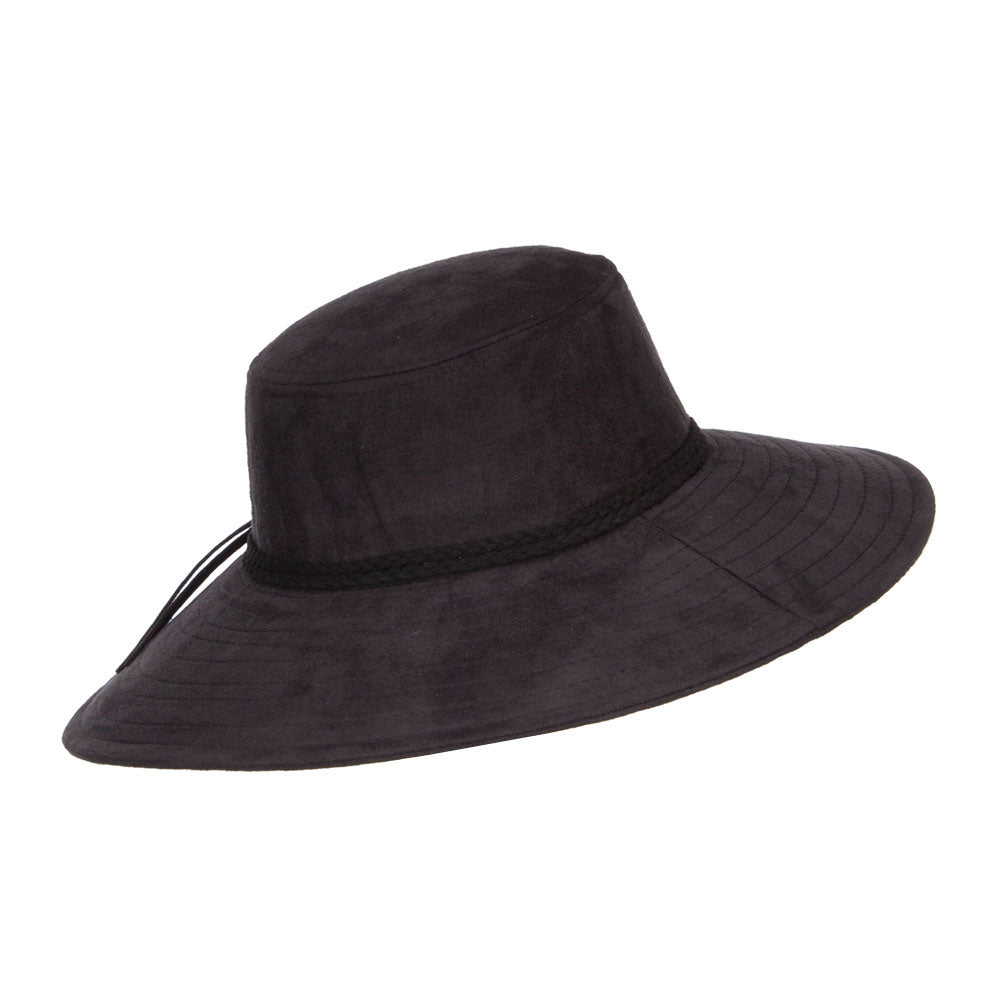Design Details, Woman's stylish poly suede hat with wide brim, cylindrical top crown