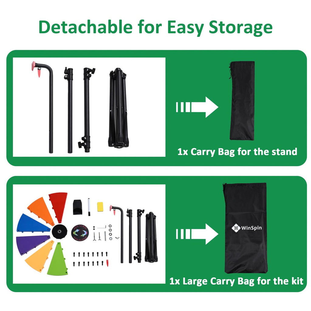 - Portability & Easy Storage - Spinning wheel for prizes enables easy assembly & disassembly, making it portable for multiple uses at trade shows, pop-up markets, school events. Its detachable design allows for compact storage, while 2 carrying bags for a hassle-free storage solution