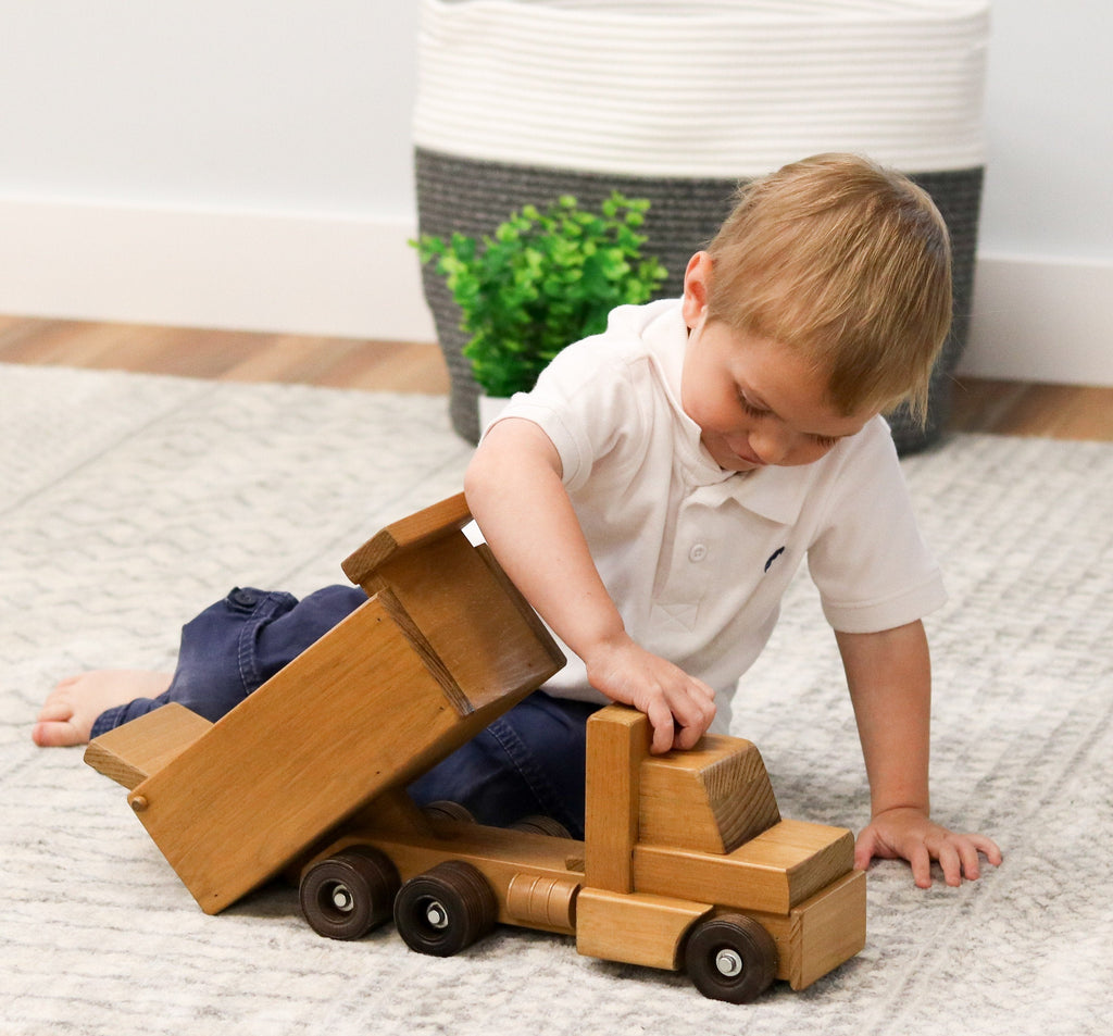 Handcrafted in the USA by Amish Woodworkers.Made From Solid, Durable Wood.Smooth-working Tilting Dump Bed and Real Rolling Wheels.CPSIA Approved Non-Toxic Finish.No Batteries or Plastic Parts – Just Pure, Imaginative Play.