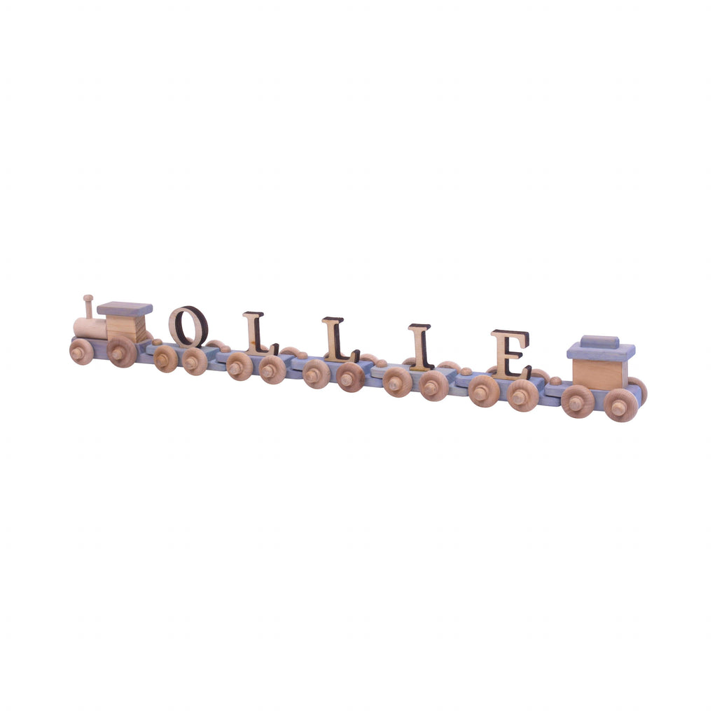 Children love seeing their names in big letters. The possibilities are endless with our personalized name trains! These unique, one-of-a-kind trains are hand crafted in Lancaster County, PA by an Amish shop. The trains are currently available in 2 color themes, and are perfect for boys or girls. These trains make a perfect gift for a baby or toddler. The personalized train cars hook together with wooden pegs, and feature real rolling wheels. Each train has an Engine a Caboose and a minimum of 3 cars. Choose a custom name or standard ABC in Baby Blue or Natural Harvest colors.