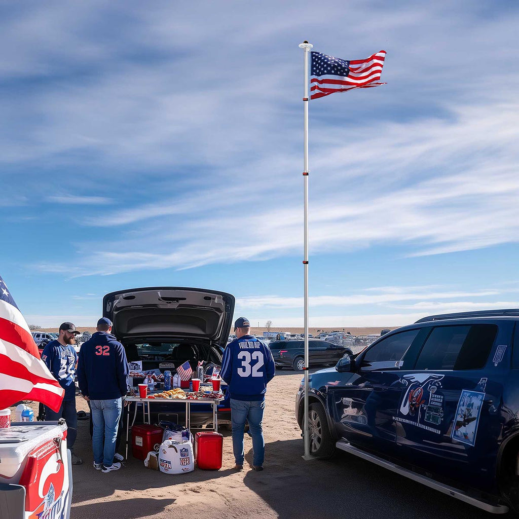 Yescom Tailgate Telescopic Flagpole Kit - The best flagpole tough enough for beach trips, tailgates, and RV adventures. Fliplock design beats Florida’s salt corrosion (no more rusty twist-lock poles!). Kit includes Aluminum Flagpole (20ft, 25ft, or 30ft - your choice), auto-illuminating solar light, 3x5ft American flag, gold topper and universal tire mount base.