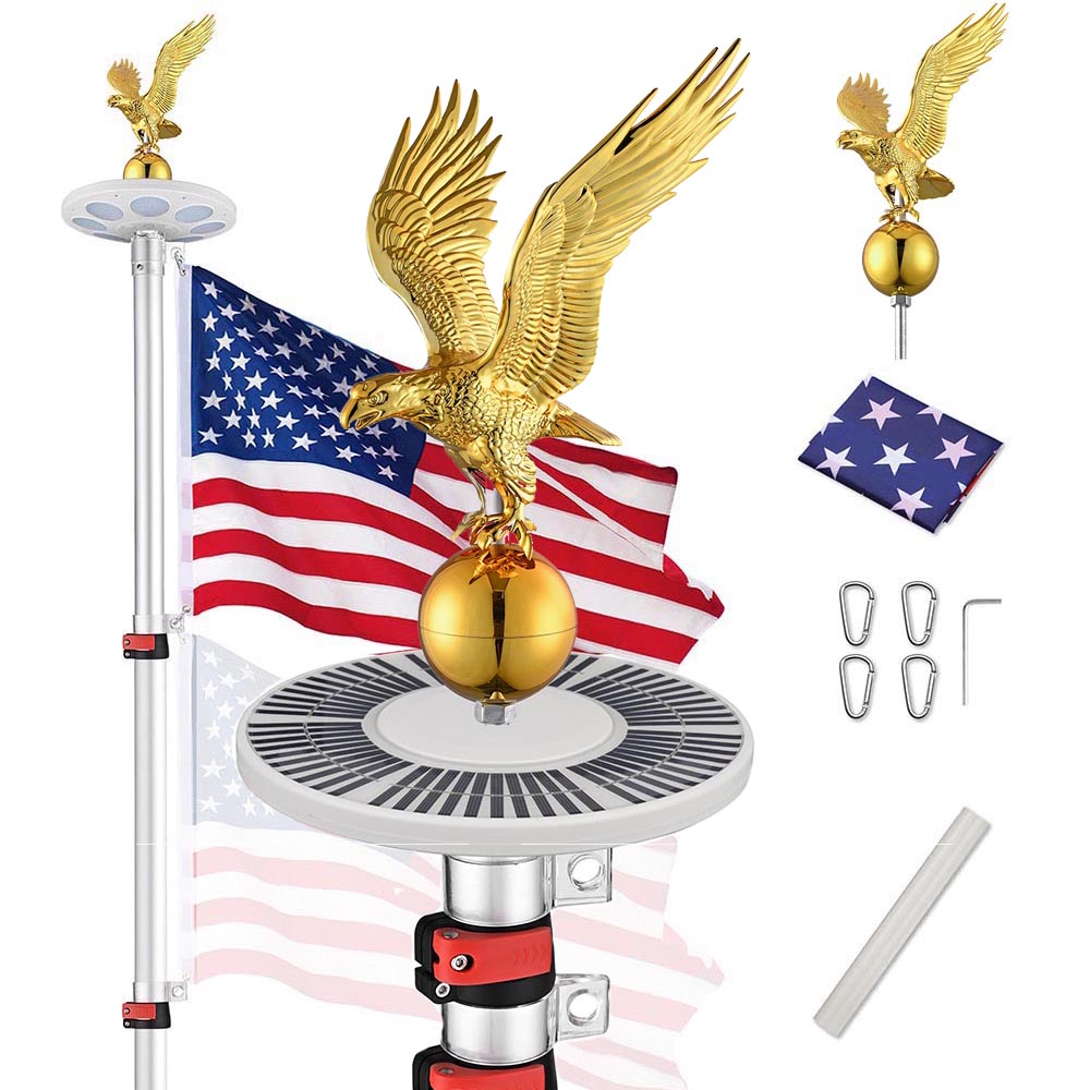 Raise your flag high with Yescom 20', 25', 30' Telescopic Flag Pole with Solar Light! Made of sturdy Thick 16 Gauge Aluminum, this flagpole is built to last. With a majestic Regal Eagle finial, symbolizing pride and independence. The flagpole light automatically turns on at night, showcasing your love for your country!