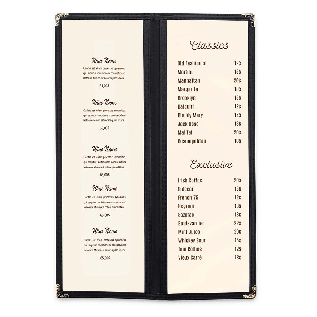 • The perfect 4.25"x14" fit is tailored for standard wine and drink lists, offering a custom look