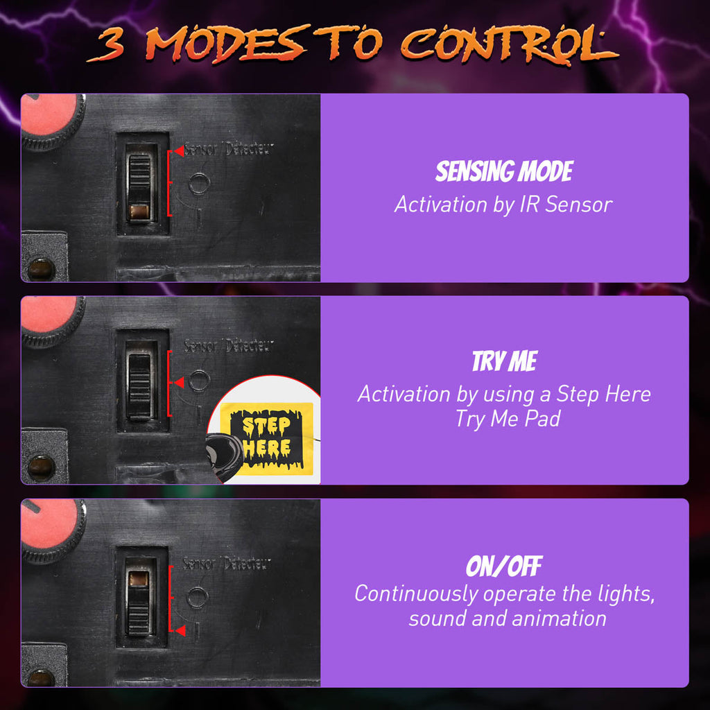 - 3 Activation Modes - Comes with a control box providing 3-mode control including Sensing Mode, Try Me, and ON, you can switch to ON to continuously operate the lights, sound, and animation, choose Try Me for foot pedal control, and Sensing Mode to activate IR sensor