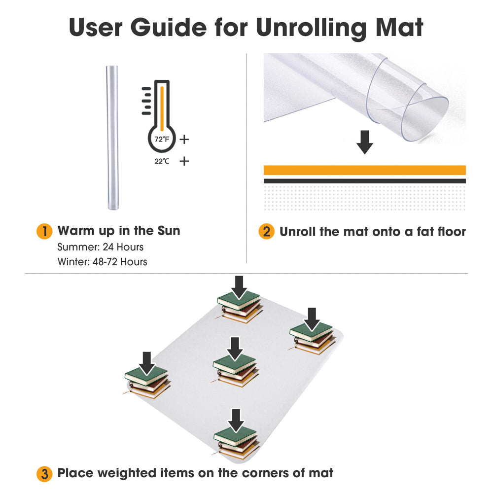 • To unroll the mat and lay it flat, it is recommended that the chair mat is placed on a smooth flat surface outside in the sun to warm it up until it flattens.