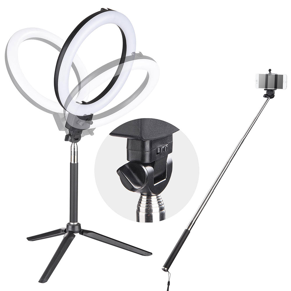 - When connecting the selfie stick with tripod and ring light, please do NOT extend the selfie stick in case of falling.