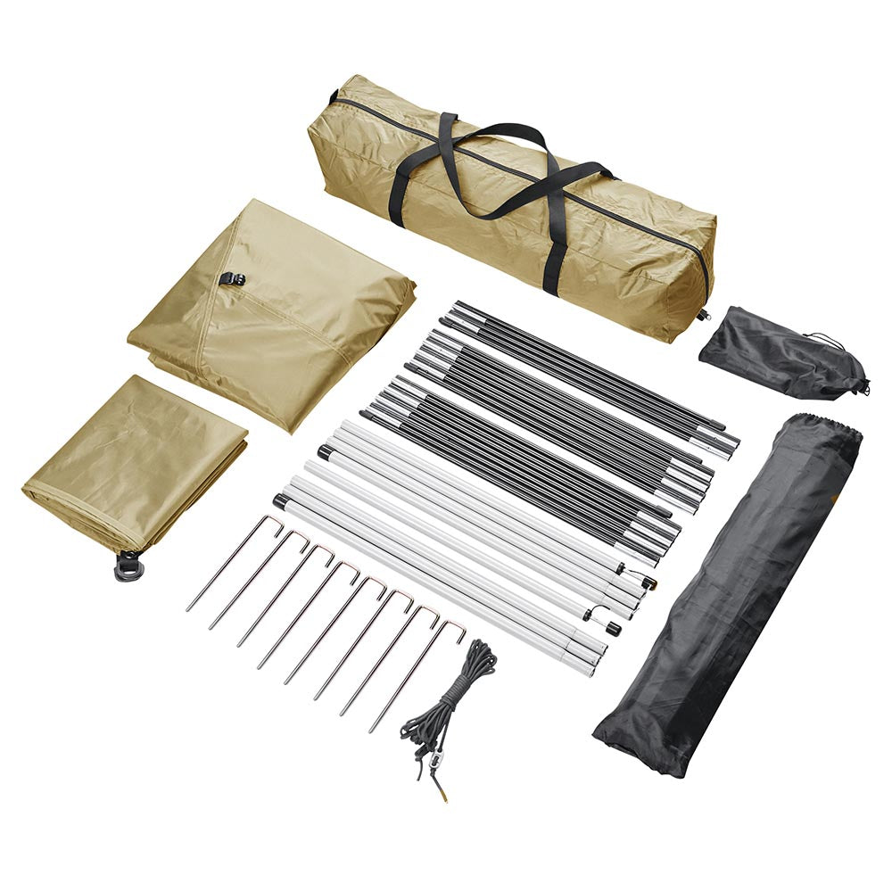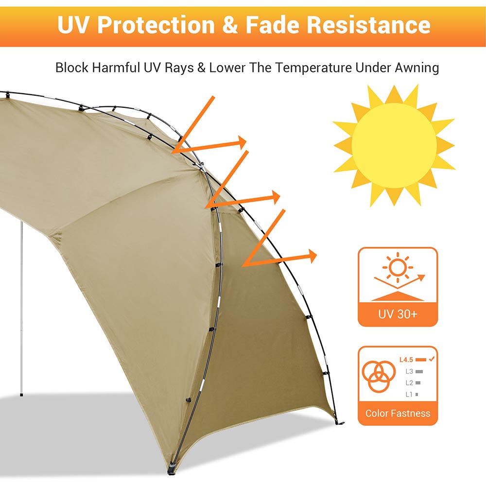 - No tools needed, easy to install the awning and secure the awning on the ground by stakes and ropes