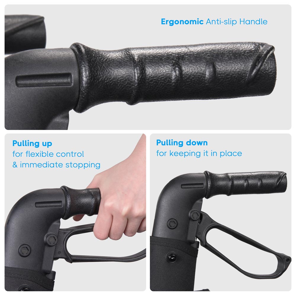 • Dual Braking System: Pulling up the handbrake for flexible control & immediate stopping, pulling down for keeping it in place