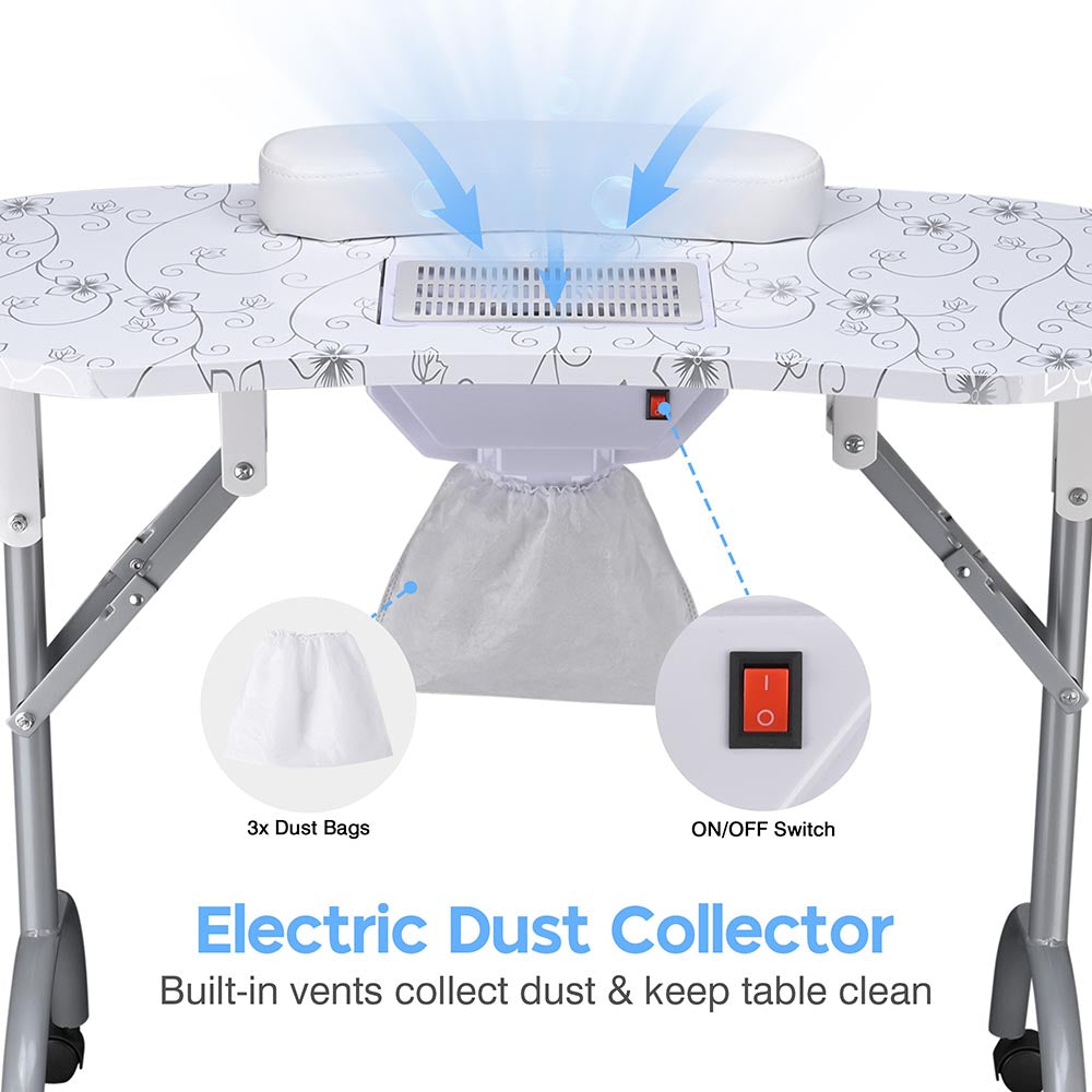 Foldable Manicure Table with dust collector, and wrist cushion, a perfect choice for professional manicurists to perform nail art at home, nail salon, and spa. With 4 swivel wheels & locking, it can be easily moved to different places.