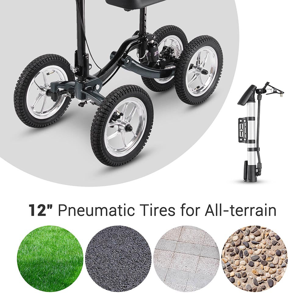 This brand-new Steerable All Terrain Knee Scooter Walker with Air pump & Basket & Brake, are an excellent crutch alternative and feature 12" diameter pneumatic tires designed to easily traverse grass, sidewalks, gravel and dirt with incredible ease and agility, not only ideal for small, kids, patients and adults recovering from injury or surgery to the foot, ankle or lower leg, also for commuters, travelers.