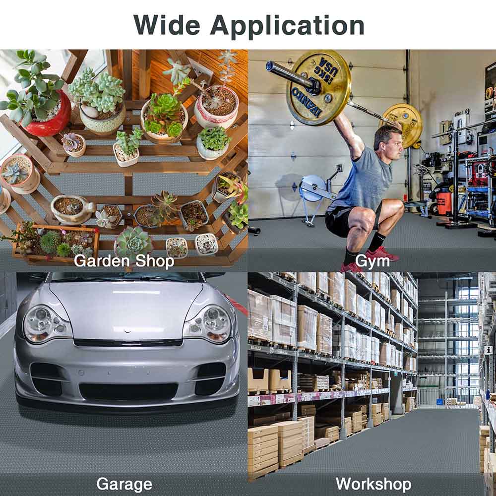 4.6ftx20ft Garage Mat Roll with 1/8 in. thickness enhances traction and slip resistance, covers concrete or wood sub-floors to prevent deterioration and hide cracks. Made of soft PVC material, it is easy to cut and clean.