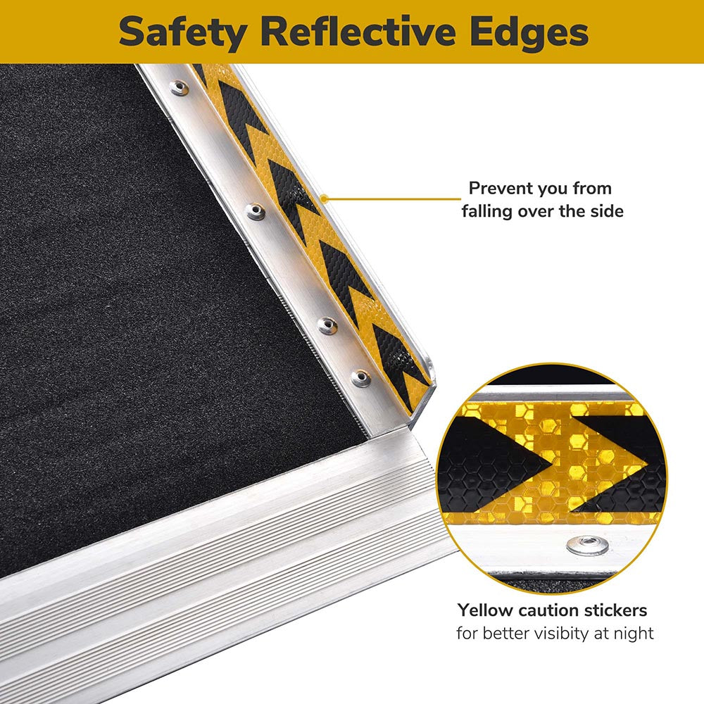 • Reflective Guardrail - Features safety guardrails on both sides to prevent the wheelchair from accidentally sliding off the ramp. Bright yellow warning signs posted on 2 sides make it clearly visible at night